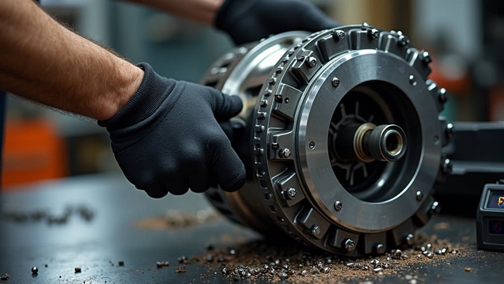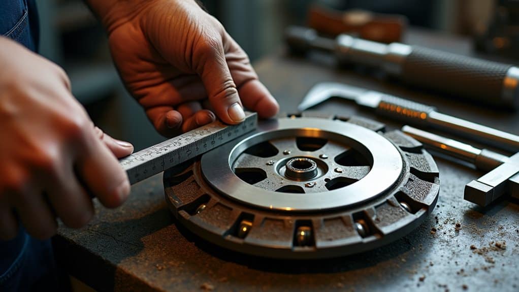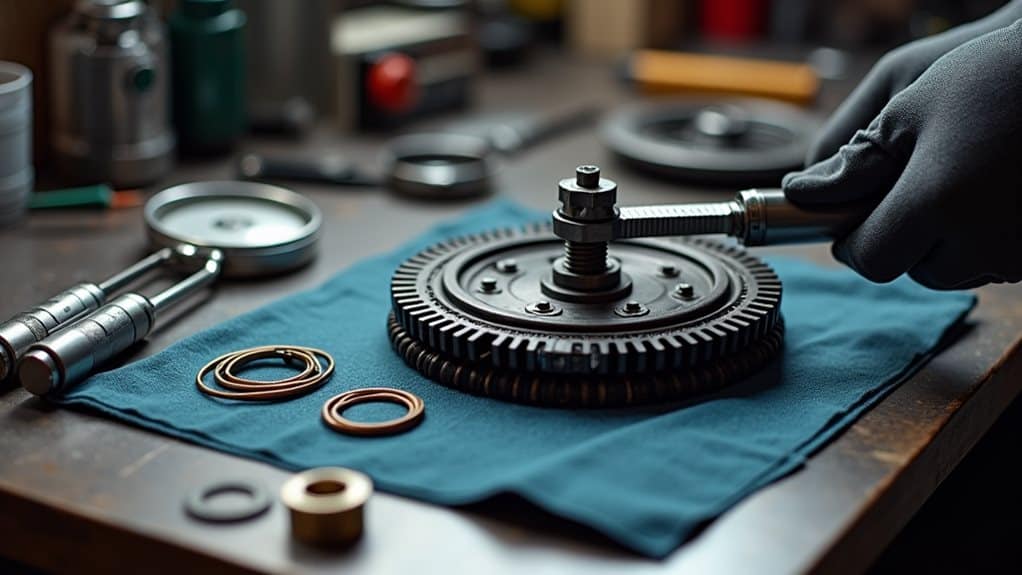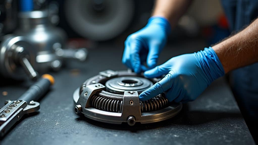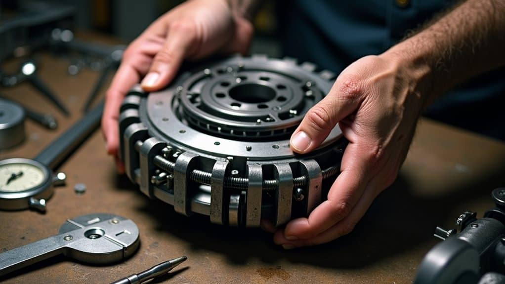 To adjust a centrifugal clutch like a pro, you'll need basic tools including a socket wrench set, feeler gauge, and safety equipment. Start by accessing the clutch assembly when the engine's completely cool, then inspect the springs for wear or damage. Make precise adjustments to spring tension by turning the adjustment screws clockwise to increase tension or counterclockwise to decrease it. Confirm you're making equal adjustments to all springs while following your engine manual's specific RPM requirements. Regular monitoring of idle speeds and proper spring tension will help prevent serious clutch issues. Understanding the complete adjustment process will change you from novice to expert.